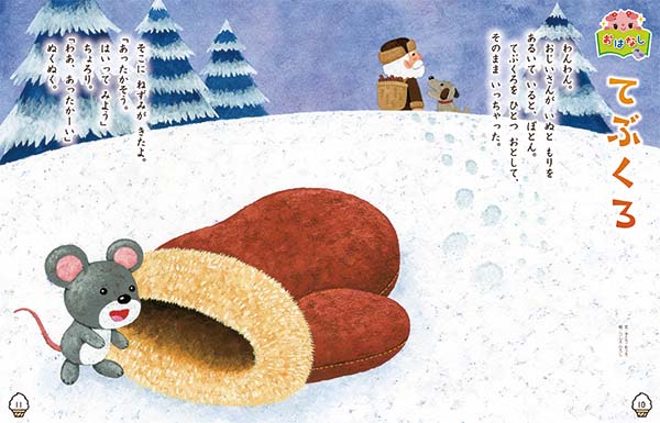 今月は,ウクライナに伝わる民話を紹介しています。森でおじいさんが落とした手袋に,ネズミ・カエル・ウサギと,次々に動物がやってきます。「いーれーて」「いーいーよ」は,子どもたちと声を合わせて読んでみましょう。お話を楽しんだあとは,「おしくらまんじゅう」などの遊びにつなげるのも楽しいでしょう。