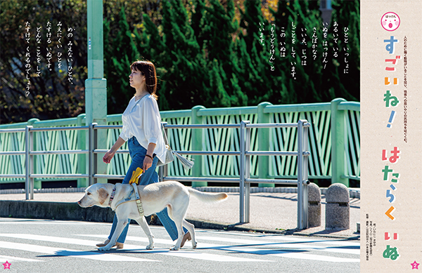 今月は,盲導犬や介助犬などの,人のために働く犬を紹介します。本欄を見て,犬はどんな仕事をしていると思うかを子どもたちに問いかけながら読み進めましょう。また,盲導犬に声をかけたり,さわろうとしたりすると仕事がしづらくなるので,遠くから見守るよう伝えてください。