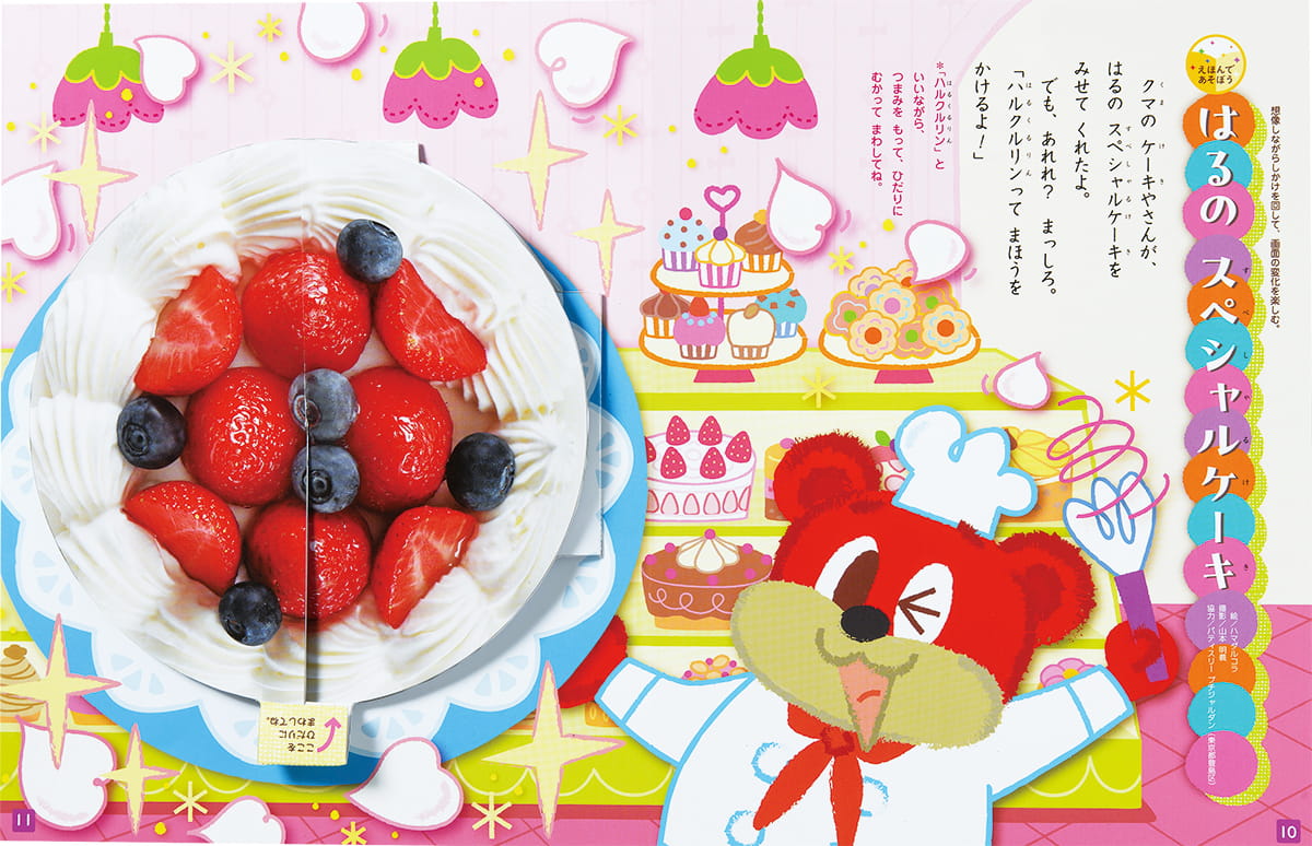 今月号は,つまみをまわすと……真っ白なケーキがイチゴたっぷりのスペシャルケーキに! イチゴの甘い香りも漂ってきます。驚きのしかけを何度も遊ぶことで,「絵本って楽しい!」と思うことでしょう。