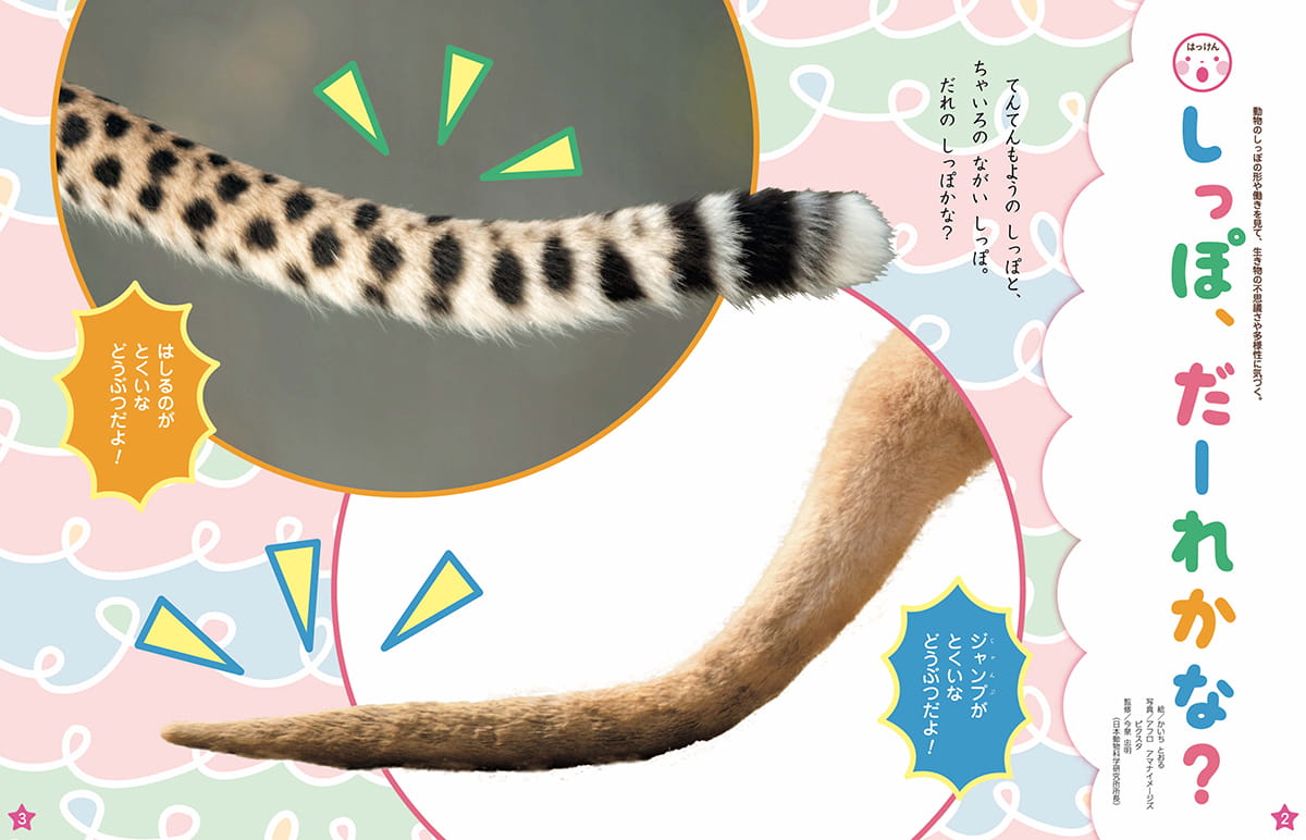 動物のしっぽには,体を支えてバランスをとったり,敵から身を守る働きなど,それぞれの暮らしにあわせた機能があります。しっぽの写真をじっくり見て,どの動物か当てるクイズに挑戦しましょう。しっぽから,観察の視点を広げて,生き物への興味や気づきを深めるきっかけになります。
