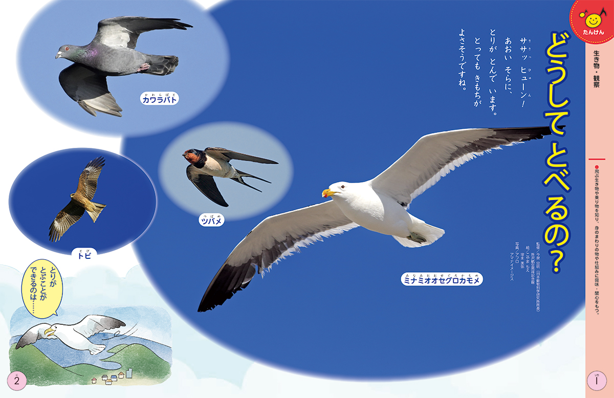 今月は,鳥や昆虫,ヘリコプターなど,「飛ぶ」生き物・乗り物を紹介しています。生き物の飛ぶための体の秘密を知ることで,生き物の興味・関心を広げられます。また,飛ぶ乗り物を知ることで,物の仕組みへの興味が深まります。本欄を楽しんだあとは,ぜひ図鑑などで調べたり,戸外に出て空を見上げてください。