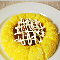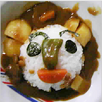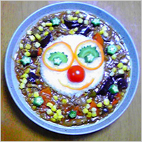 父の日のメニューの主役は、お父さんの顔のカレー! 眼鏡は、カラーピーマンの輪切りで作りました。鼻をミニトマトにしたら、ピエロのようになった、ユーモラスで楽しい一皿です!