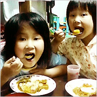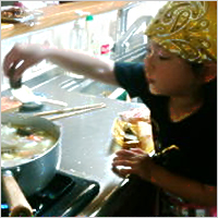 小学生のお姉さんと一緒にお料理実習! 鍋を火にかけるまでは、2人で協力して下ごしらえしました。おかたづけまでしっかり終えて実習終了!