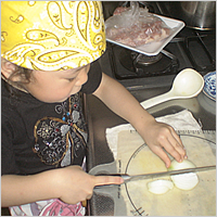 野菜切りに初挑戦! 玉ねぎが目に染みて痛くても、とても楽しく作れました。家族からの「おいしい」の言葉に、「また作ろうね」とクッキングに目覚めました!