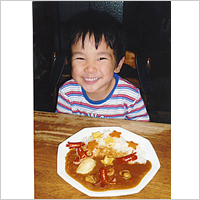 目と鼻はゆでたまご、めがねはのり、口はハム、そしてカレーで髪の毛を表現したお父さんの顔カレー。作るのも食べるのも楽しめました。