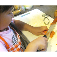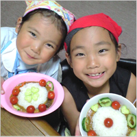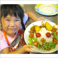 庭で採れたミニトマト、なす、きゅうりを使って娘さん2人と夏野菜カレー作りに挑戦。4歳の娘さんは包丁を使うのがはじめてでしたが、じょうずにできたそうです。「このままとっておきたいわ」と言いながら、笑顔でいただきました。