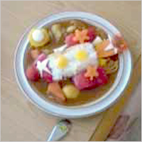 耳はじゃがいも、目はミニトマト、口はエビで作りました。まわりには星型のにんじんと水菜を散らして、黄色、赤、緑と彩りもきれいな野菜たっぷりカレーのできあがり!