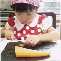 料理が大好きな4歳の息子さんは、マイ包丁を持っているとのこと。1歳の娘さんは、真剣なお兄ちゃんの横でつまみ食い。髪の毛の部分をとんかつソースで描いて完成。ソースの甘味が加わって、おいしさ倍増です。