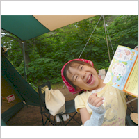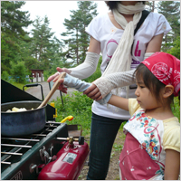夏にはじめてのキャンプで、幼稚園からいただいたルウを使って親子でカレーを作りました。娘さんが盛りつけを担当。チーズで顔を描くなど、工夫をしました。外で食べたカレーは、とてもおいしかったそうです。