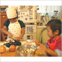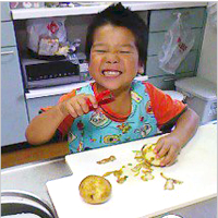 最近、よくお手伝いをしてくれるようになったという息子さん。野菜の皮むきもとてもじょうずになり、ほめられると得意顔! 今回はお兄ちゃんも一緒に、二人でがんばっておいしいカレーを作りました。