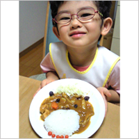レーズンで目と鼻をつけ、キャベツの千切りを髪の毛に見立てて飾りました。おじいさんが家庭菜園で作ったマイクロトマトは、えり元に。生野菜が苦手なお子さんも、キャベツはカレーと混ぜて食べられたそうです。