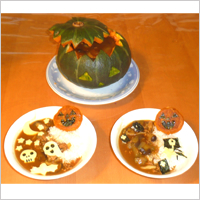 「私が包丁で切るから、きのこをさいてね」と、年長のお姉ちゃんが2歳の弟さんとの分担を決めてくれたおかげで、仲よく作れました。おばけのかぼちゃをくり抜いてカレーの入れ物にしたところ、二人とも大喜び!