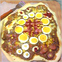 うま味がたっぷり溶け出した二日目の濃厚カレーは、ピザの具になります。今日は、息子さんがかわいくお花畑風にトッピングをしてくれたそうです。カレーライスとはまた違った魅力で、とってもおいしそう!