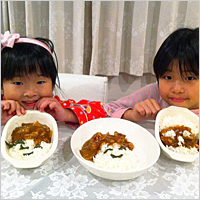 幼稚園からもらったルウで、兄弟2人だけで作りました。ナン作りにも挑戦!玉ねぎで目が痛くなったようで、いつの間にかプールのゴーグルを着けていました。できたカレーは、とってもおいしくいただきました。