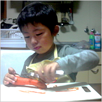 幼稚園で、カレーの料理体験後にルウをいただき「今日の夜もカレーを作りたい」ということで、一緒に作りました。園でも体験した野菜の皮むきのお手伝いをしてもらいました。お手伝いした分、いつも以上に食べてくれました。