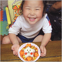 ごはんに薄焼き卵をのせ、口や目はのりを使ってハロウィンを表現しました。次男と三男は、はじめてのカレー作りで、次男が切っているニンジンを横にいる三男が食べてしまうハプニングもありましたが、楽しく作れました。