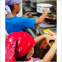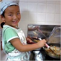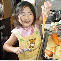 ひいおばあちゃんに「自分で作ったカレーを食べさせたい」と、クッキング。野菜を切るとき、力を入れすぎて手が痛くなってしまったけれど、ちょっと休んで、ルウを入れてかき混ぜるお手伝い。ひいおばあちゃんも、とても喜んでくれました。