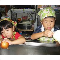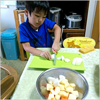 幼稚園からルウをもらって帰ってきました。とても喜んで、帰ってきてすぐに作り始めました。包丁を使うのははじめてでしたが、じょうずにできました。「また作ってあげるね」と、頼もしい一言が聞かれました。
