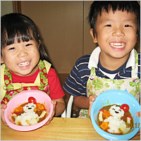 家族全員で作りました。子どもたちは、はじめての料理で、パパと材料の買い出しからスタート。野菜の型抜きが楽しかったようです。顔はのり、手はマカロニ、手袋はカニかま、帽子はミニトマトで飾りました。2人ともおかわりをしていました。