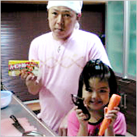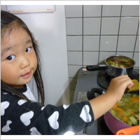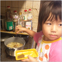保育園でもらったルウを使って、「ママと弟に食べてもらうの」と、パパと一緒に作りました。野菜が大きくて、でもやわらかくて、すごくおいしいカレーが完成。みんなたくさんおかわりをしました。