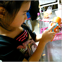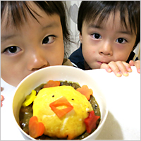 普段からお手伝いをしてくれる4歳の娘が、幼稚園でカレーのルウをもらってきました。リーフレットを見て作る気満々。娘が玉ねぎを包丁で切り、ママと弟は一緒に隣で応援。さらに娘は薄焼き玉子を焼き、ごはんに巻いてカレーの中に。特製ひよこカレーの完成です!