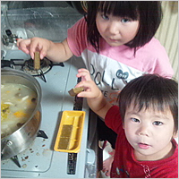幼稚園からもらったルウでカレー作り。お姉ちゃんとルウを入れて、おいしいカレーができました。男の子も料理ができなきゃ!!(笑)