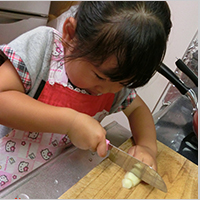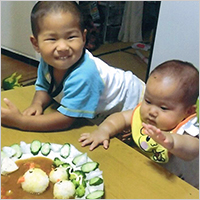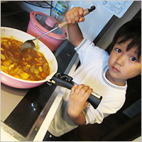 お兄ちゃん(3歳9か月)と初めて、カレー作り。お兄ちゃんは、ごはんの米とぎとルウを入れてくれました。弟(9か月)も大喜び。食べられないけど・・・。