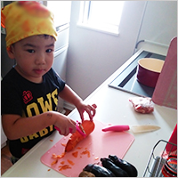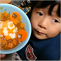 親子でチャレンジ!に初めて応募しました。3歳なったばかりの息子もカレーは大好物です~。初めて野菜の皮むきや包丁で切ったり炒めさせたりも挑戦させ、怖がりながらも楽しんで真剣に料理していました。盛り付けは大好きなキャラクターに。毎回カレーを作るときは、子どもが野菜をいっぱい食べられるようにとニンジンシリシリや野菜ジュースを入れています。