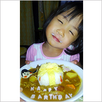 園でいただいたおみやげのルウを使って、大好きなお姉ちゃんの誕生日にデコカレーのプレゼント。玉ねぎの皮むきや、型抜き、デコレーションをがんばった年少さん。「絶対おいしいよ!」の自信満々の笑顔で家族で幸せな気持ちになりました。