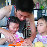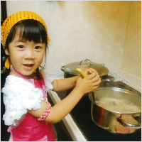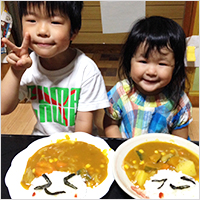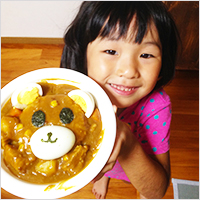 保育園で毎月クッキングの日があり、3歳児ですが、包丁もじょうずに使用しています。エプロン姿もきまって、おなべをぐるぐるかきまぜて、お豆さんがたくさん入っているおいしいカレーができあがりました。ごちそうさまでした。