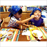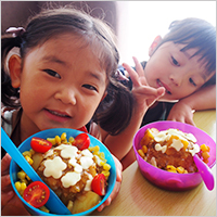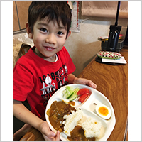 お友だちと一緒にカレーを作って食べました!野菜の皮をむく、包丁を使って切る、カレールウを入れる、などなど…たくさんお手伝いしてくれました(^^)最後にチーズの型抜きをして、ミニトマト&コーンで飾りつけをして、おいしくいただきました(^^)