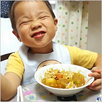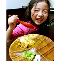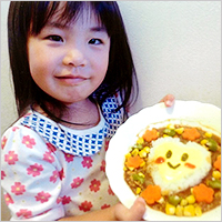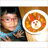 カレーライスが大好物で、家族がシチューが食べたいと言っても、「カレーがいい」といつもカレーに変更してしまうほどです。年長になり、初めて自分で大好きなウサギのカレーを作りました。鼻と口のシメジは苦手でしたが、ペロッと食べてしまいました!