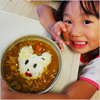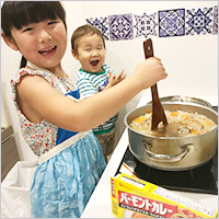 以前から料理のお手伝いをよくしてくれていました。幼稚園でカレーを作り、今回バーモントのルウをいただいてからは、毎回リーフレットを見ながら、自分でやるから!と意気込んでいました。
