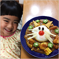 おじいちゃんの畑の夏野菜をたくさん使って、おいしいカレーができたよ!大好きなネコちゃんカレーです!!もりもり食べました。