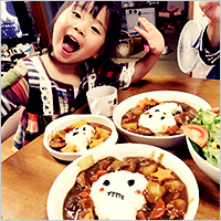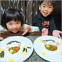 いちばんの大好物はカレー。幼稚園からカレールウをうれしそうにもらってきました。カレーを食べるニコニコ顔を作りたいとリクエスト。お姉ちゃんと協力してかわいいカレーできました。おいしすぎて、もちろんおかわりしちゃった。