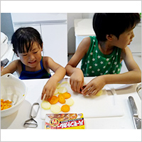 盛り付けレシピをもとに、リボンカレーを作りました。涙が出ないよう鼻にティッシュを詰めて、タマネギの皮むきを手伝ってくれました。