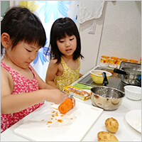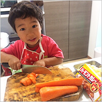 通っているこども園から食育活動としてルウをいただきました。ピーラーで野菜の皮をむく、切る、ルウを入れる、を一緒にしました。ふだんからバーモントカレー甘口を食べていたので、大好きなカレーが作れてなおさら楽しかったようです。