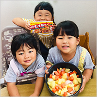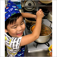 幼稚園のカレーパーティーのおみやげでもらったルウを使ってお料理教室をしました。4歳と2歳のいとこ同士、初めてまともに包丁を持たせたのでとてもハラハラしました。でも、できるだけ自分たちの力加減でさせてみたら、お鍋からあふれそうなくらいたくさん切ってくれました! できあがったカレーも仲よくおいしくいただきました(^^)