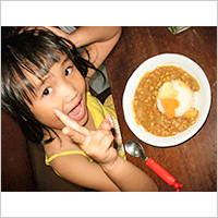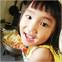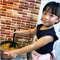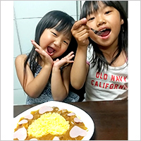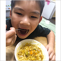 「こんなカレーを作りたい」って絵を描いてから、具を一生懸命切りました。絵のようにできあがあり、「おいしー」って喜んでいました。