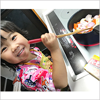 リーフレットを見ながら子どもと一緒に作りました。後片付けのことも書いてあったので、子どもが進んでお皿洗いをしてくれたのはうれしかったです。今まで野菜を切るお手伝いはしてもらったことがあったのですが、今回は炒めたり、盛りつけまで頑張ってくれました。ニンジンとサツマイモをハートに抜いてトッピングしてみたりと、親子で楽しく料理できました。