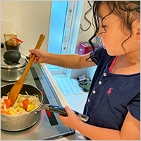 園からバーモントカレーをいただきました。もらってきた帰り道、「今日はカレー」と意気込み、用意してあった豚丼のお鍋にポトンと……よほど作りたかったようです。翌日の土曜日にカレーを作りました。真剣な眼差しで野菜を炒めているところです。自分で作ったカレーは「おいしい」とモリモリ食べおかわりもしました。カレールウをきっかけに、親子ともども楽しいクッキングとなりました。