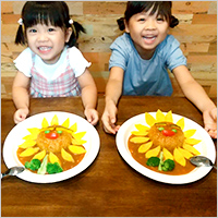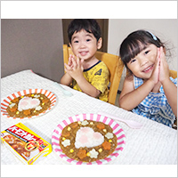 いつも食べているカレーですが、通っているこども園で、ルウをいただきました。今回は、初めて妹も一緒に作って食べました。夏らしい盛りつけを姉が考えて、母が知恵を絞り、楽しく作って、野菜も完食しました。