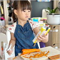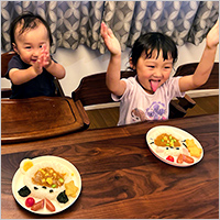 いつもはお兄ちゃんのお手伝いの見学のみということが多かったのですが、今回は自分で挑戦しました。包丁を持って、にんじんやおいもを切り、お鍋に入れて炒め、ルウを入れて煮詰めます。ごはんも自分でお米をといで炊き、お皿に盛りつけて、完成! 途中で投げ出すことなく、最後まで自分でがんばりました!