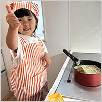 カレーが好きな娘。「幼稚園からもらったよ〜!」と作る前から楽しみにしており、クッキング当日には自分でエプロンを探してくる姿がかわいらしかったです。切った具材をお鍋に入れ、水を入れ、ルウを入れてくれました。ルウを入れる瞬間は少し緊張気味で、完成するとすごくうれしそう……。とても楽しかったみたいです。