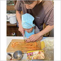 料理人の父から初めて包丁を教えてもらい、一緒にカレーを作りました! 「玉ねぎで目が痛い〜」などと言いつつも、真面目に取り組む姿に成長を感じました。完成後はたくさんおかわりしてモリモリ食べており、とても有意義な時間になりました。ありがとうございました。