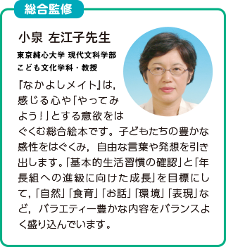 なかよりメイト 子どもたちの豊かな感性を育て、自由な言葉や発送を引き出すことをねらいとした総合絵本です。 A4変形判/オールカラー 定価(付録共)430円(本体399円)